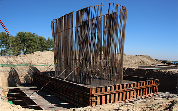 4、先進行平面模板的調裝,然后進行圓弧模板的調裝,就位后模板外側用斜撐進行加固,調整后與墩身模板進行連接固定然后對左右側模板進行吊裝。